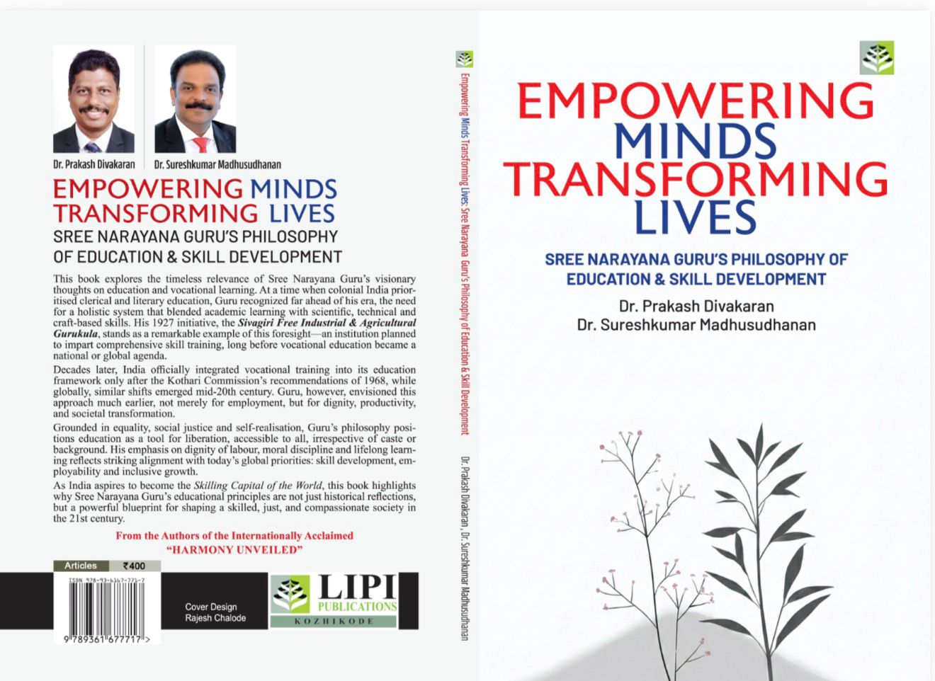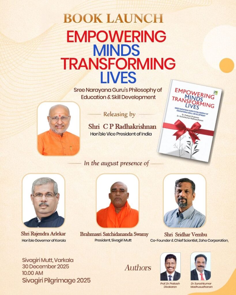 Empowering Minds. Transforming Lives: Sree Narayana Guru’s Philosophy of Education & Skill Development, authored by Prof. Dr. Prakash Divakaran and Dr. Suresh Kumar Madhusudhanan, will be released by C. P. Radhakrishnan, Hon’ble Vice President of India, during the 93rd Sivagiri Pilgrimage on 30 December 2025 at Sivagiri. The first copy will be presented to Rajendra Arlekar, Hon’ble Governor of Kerala.