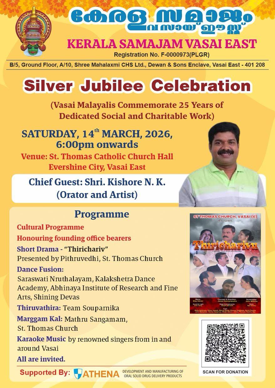 Kerala Samajam, Vasai (East), marked its Silver Jubilee with great enthusiasm and cultural vibrancy at the St. Thomas Church Hall, Evershine Nagar, Vasai (East), last Sunday. The grand celebration witnessed an impressive gathering of members and well-wishers from the Malayali community.