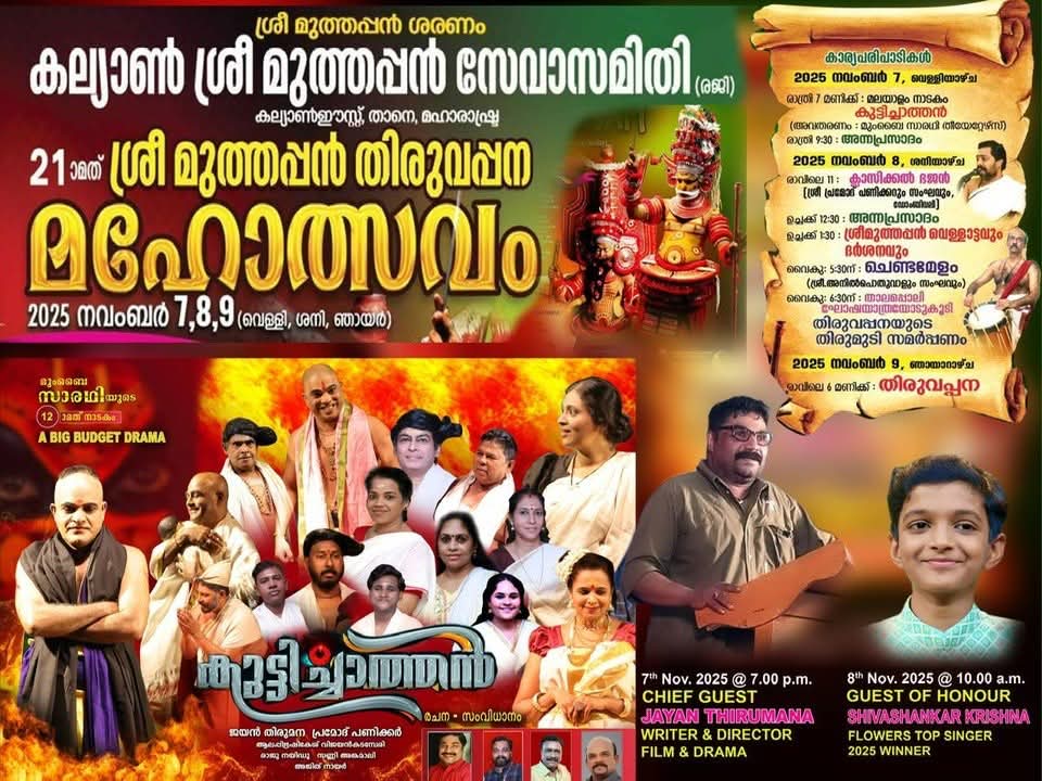 Kalyan Sree Muthappan Seva Samithi is conducting Sree Muthappan Thiruvappana Mahotsavam from 7th November 2025 till 9th November. As a part of the event popular malayalam drama Kuttichathan by Sarathi Theatres will be staged on 7th from 7 pm onwards. Classical bhajan by Pramod Panicker and team on 8th from 11 am onwards, Muthappan Vellatta darshanam at 1.30 and Chenda Melam by Anil Poduval and team at 5.30. There will be Thirumudi samarppanam of Thiruvappana accompanied by procession at 6.30 pm and the event will conclude on 9th November with Thiruvappana at 6 am.
