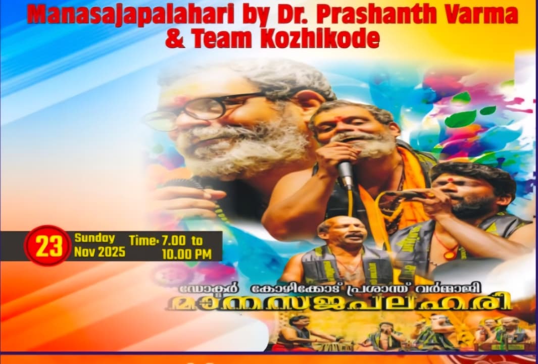 As a part of the ongoing Mandala Pooja Mahotsavam, Sri Ayyappa Sangham, Shell Colony is presenting an evening of devotional bhajans ‘ Manasajapalahari’ by the popular Dr. Prasanth Varmaji and his troupe today (November 23) evening from 7 pm onwards at Shell Colony ground, Chembur. Admission is free. For more details contact on +91 98208 20735
