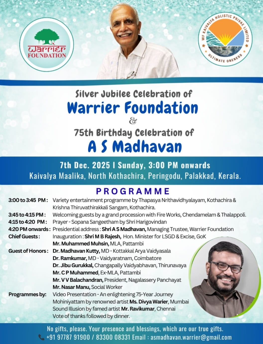 Mr. Madhavan is the founder of the Warrier Foundation, a charitable trust dedicated to supporting the poor and upliftment of underprivileged communities. Under his vision, the foundation has successfully implemented several impactful projects in education, housing, senior living, Ayurveda, farmer empowerment, women empowerment, and skill development.