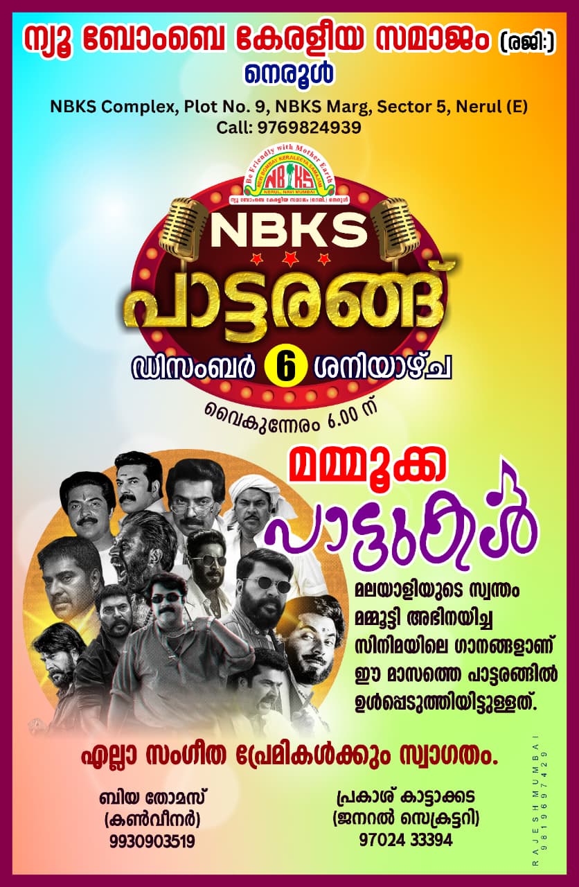 The New Bombay Keralaleeya Samajam (NBKS), Nerul (Regd.), will be hosting a grand musical evening titled “NBKS Pattarangu” on Saturday, December 6, starting at 6:00 PM at the NBKS Complex, Plot No. 9, NBKS Marg, Sector 5, Nerul (E).