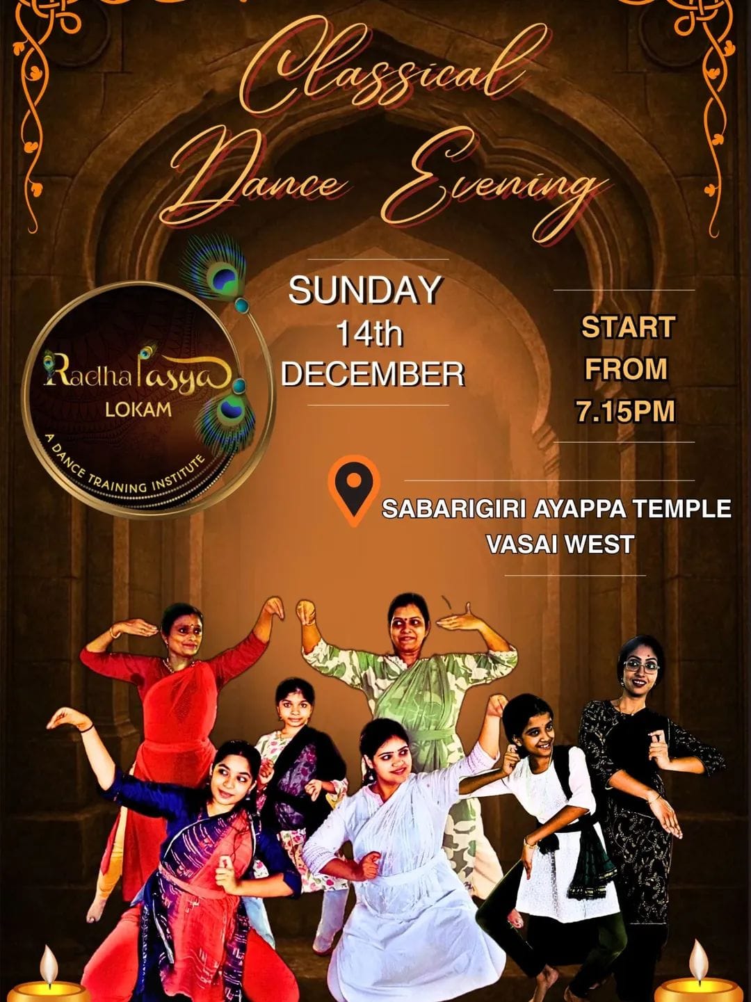 Radhalasya Lokam, a well-known dance training institute based in Mumbai, will be presenting a captivating Classical Dance Evening on Sunday, 14th December 2025 at the Sabarigiri Ayyappa Temple, Vasai West. The programme will commence at 7:15 p.m., offering an enriching cultural experience for the local community.
