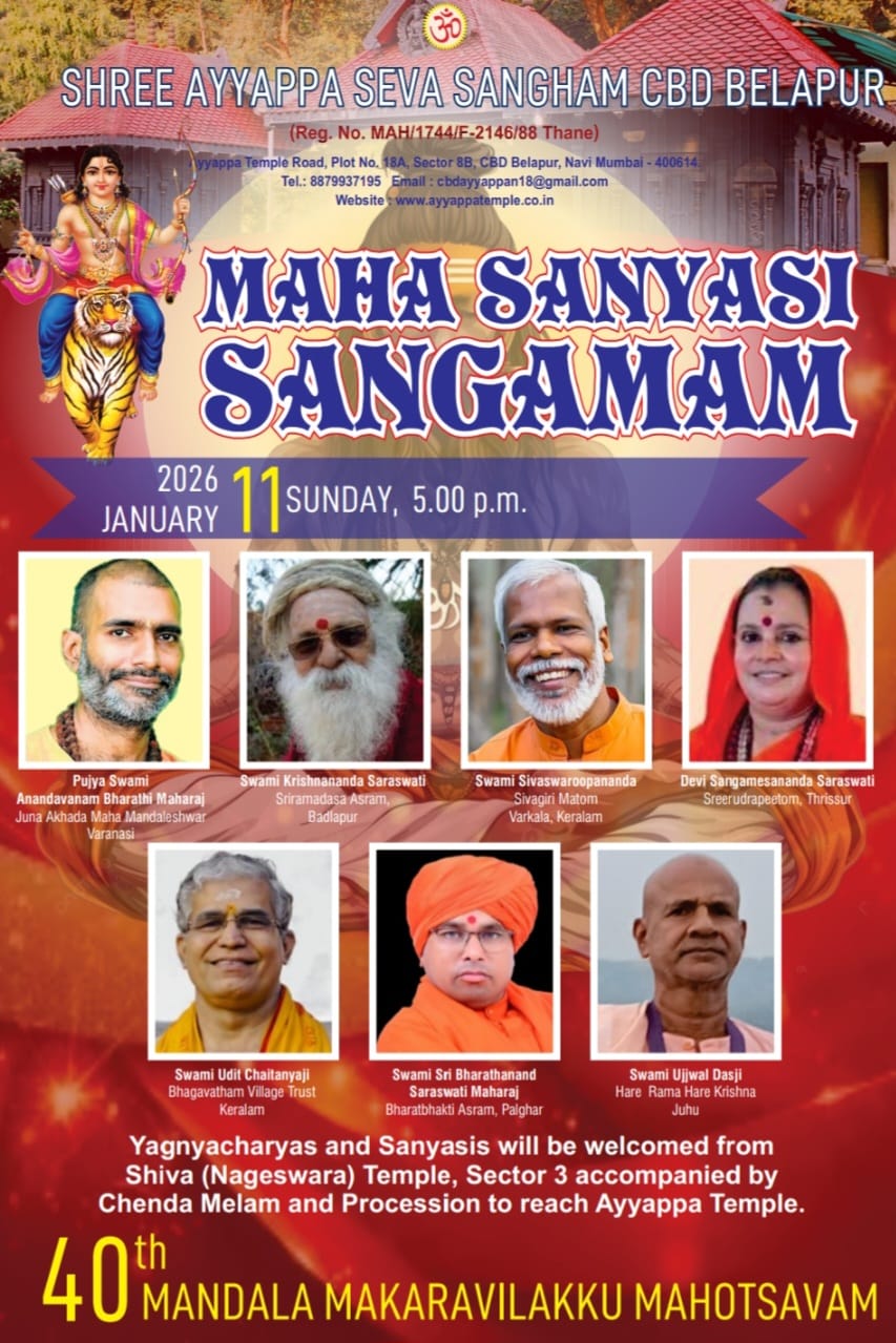 As part of the 40th Mandala Makaravilakku Mahotsavam, Shree Ayyappa Seva Sangham, CBD Belapur, will organise a Maha Sanyasi Sangamam on Sunday, January 11, 2026, at 5.00 pm at the Ayyappa Temple, CBD Belapur, Navi Mumbai.