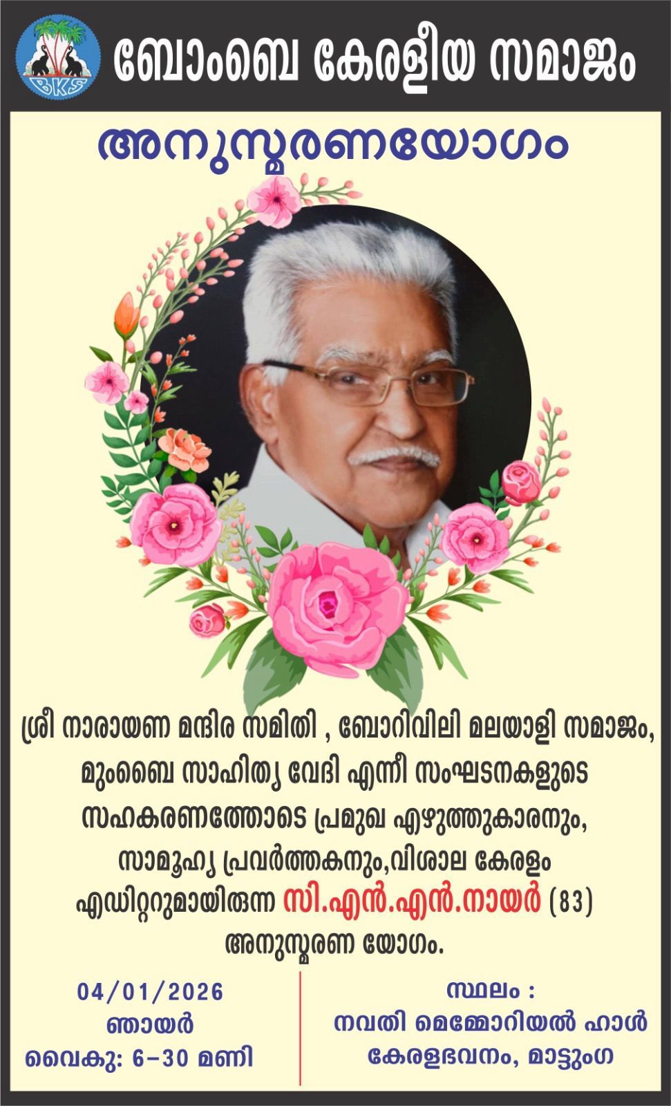 An Anusmaranayogam (memorial meeting) will be held in remembrance of C. N.N. Nair (83), a respected social worker and senior member of the Borivali Malayali Samajam, who passed away recently.