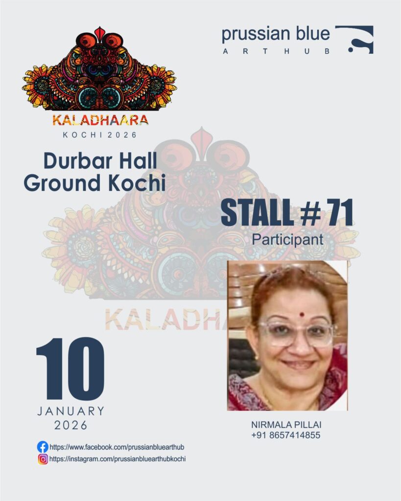 Kochi: Renowned artist Nirmala Pillai is participating in Kaladhaara Kochi 2026, a prestigious art exhibition organized by Prussian Blue Art Hub, being held at Durbar Hall Ground, Kochi, on January 10, 2026.