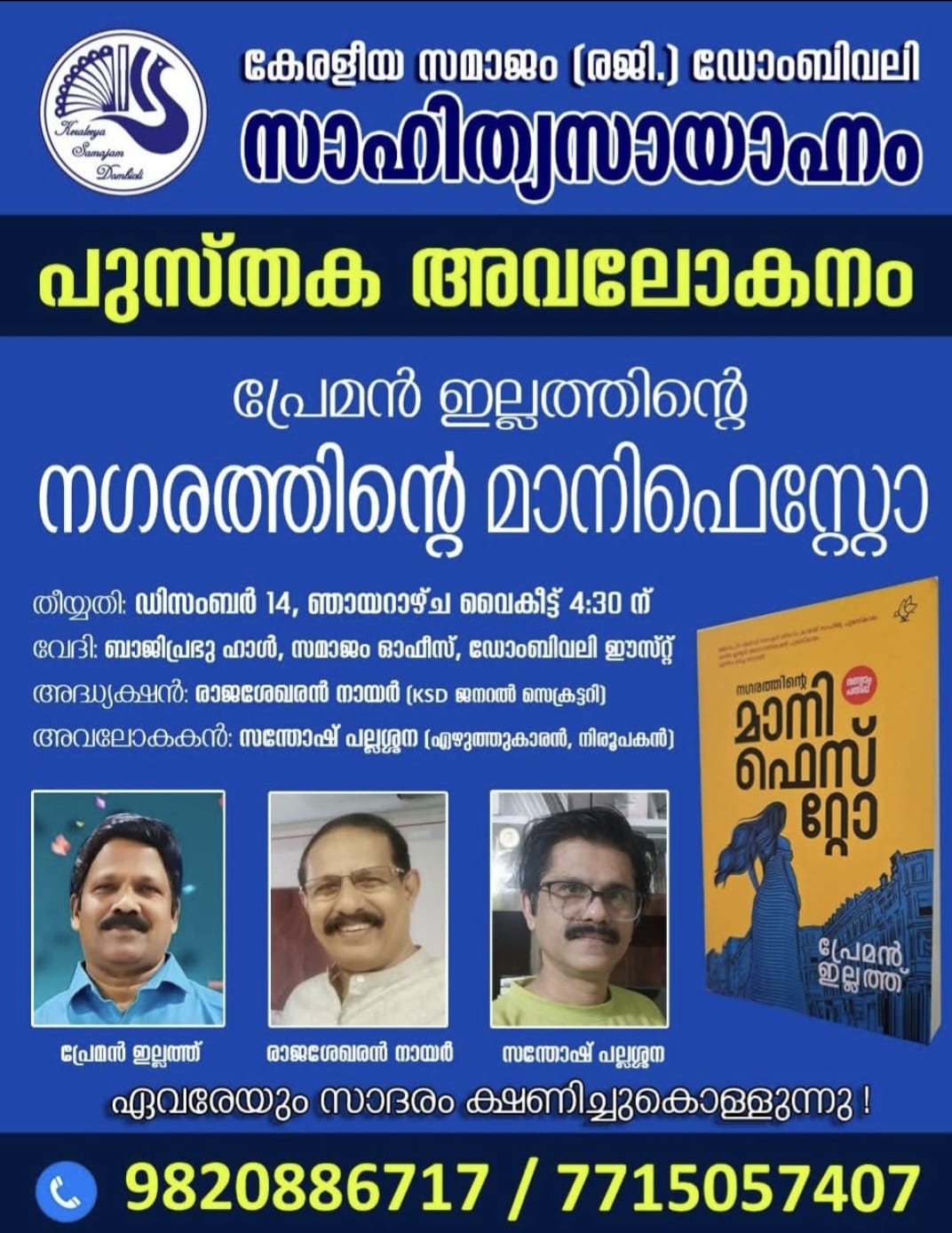 Keraleeya Samajam (Regd.), Dombivli, is organising a Literary Evening featuring a book review of Manifesto of the City ( നഗരത്തിന്റെ മാനിഫെസ്റ്റോ ) by noted writer Preman Illath. The programme will be held on Sunday, December 14, at 4.30 pm at Baji Prabhu Hall, Samajam Office, Dombivli East.