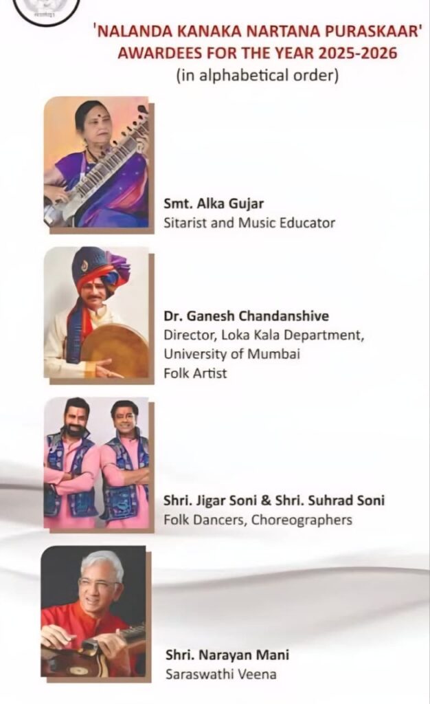 Mumbai: The Nalanda Dance Research Centre will confer Nalanda’s Kanaka Nartana Puraskaar – 2025 on distinguished artistes for their outstanding contribution to Indian classical and folk arts. The award ceremony will be held on Sunday, 11 January 2026, from 6.00 pm onwards, at Kanaka Sabha, Nalanda Dance Research Centre, Vile Parle (West), Mumbai.