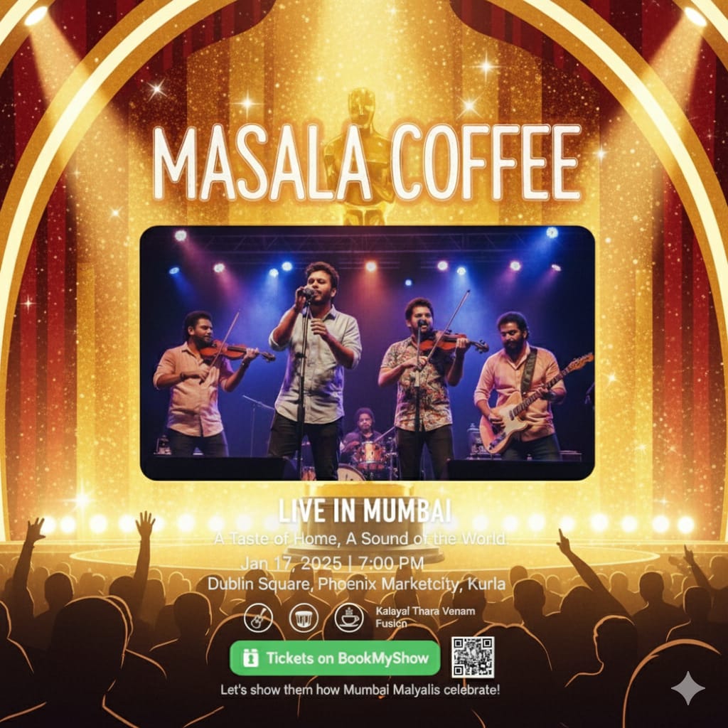 The popular fusion band Masala Coffee is set to perform live in Mumbai on January 17, 2025, at 7.00 pm at Dublin Square, Phoenix Marketcity, Kurla. Titled “Live in Mumbai – A Taste of Home, A Sound of the World”, the concert promises an energetic blend of folk, classical and contemporary music, offering a nostalgic musical experience for the city’s Malayali community and music lovers alike. Tickets are available on BookMyShow.