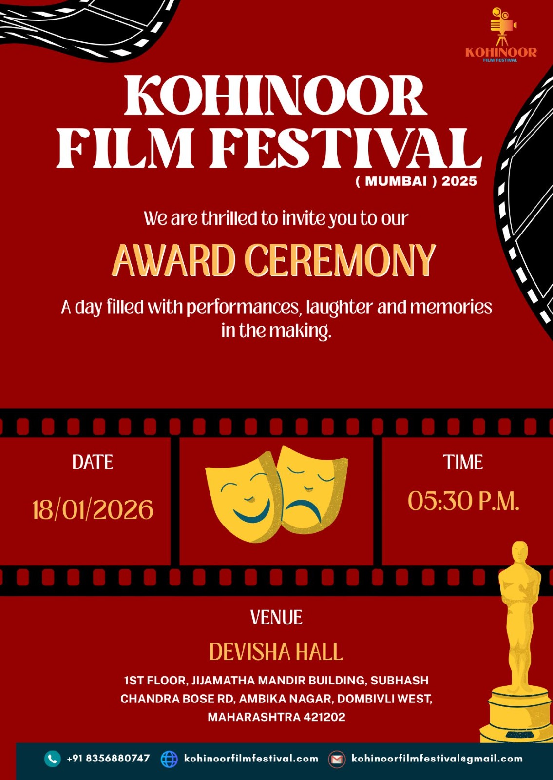 The Kohinoor Film Festival (Mumbai) 2025 will host its grand Award Ceremony on January 18, 2026, at Devisha Hall, Dombivli West, starting at 5.30 pm. The evening promises a lively celebration of cinema with performances, joy, and memorable moments.