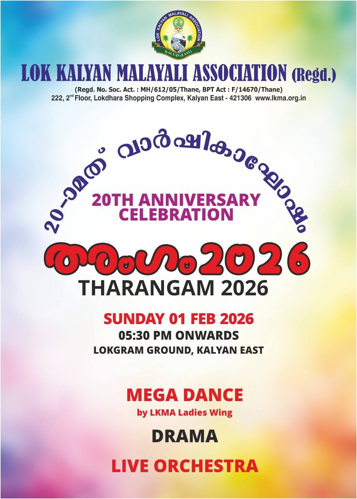 The Lok Kalyan Malayali Association (LKMA), Kalyan East, will mark its 20th anniversary with a grand annual get-together titled ‘Tharangam 2026’ on Sunday, 1 February 2026, from 5.30 pm onwards at Lokgram Ground, Kalyan East.
