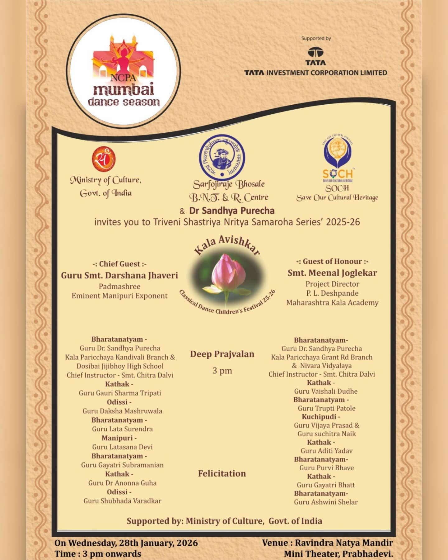 Kala Avishkar – Classical Dance Children’s Festival 2025–26, presented by Sarfojiraje Bhosale B.N.T. & R. Centre and Guru Dr. Sandhya Purecha, will be held on Wednesday, 28 January 2026, from 3.00 pm onwards at Ravindra Natya Mandir, Mini Theatre, Prabhadevi, Mumbai, as part of the NCPA Mumbai Dance Season. The festival will showcase young and emerging talents through performances in five Indian classical dance styles, highlighting the importance of nurturing the next generation of artistes while preserving India’s rich cultural traditions. The programme will include ceremonial Deep Prajvalan and felicitation of eminent personalities from the field of classical arts.