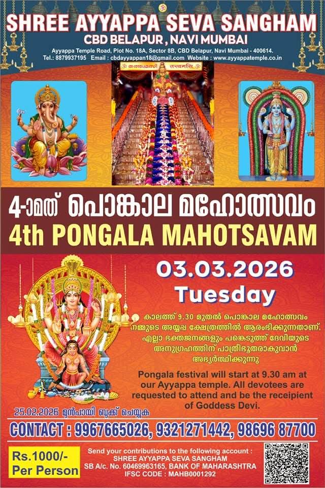 Shree Ayyappa Seva Sangham, CBD Belapur, Navi Mumbai, will conduct its 4th Pongala Festival on Tuesday, 3rd March 2026, at the Ayyappa Temple, Sector 8B, CBD Belapur.