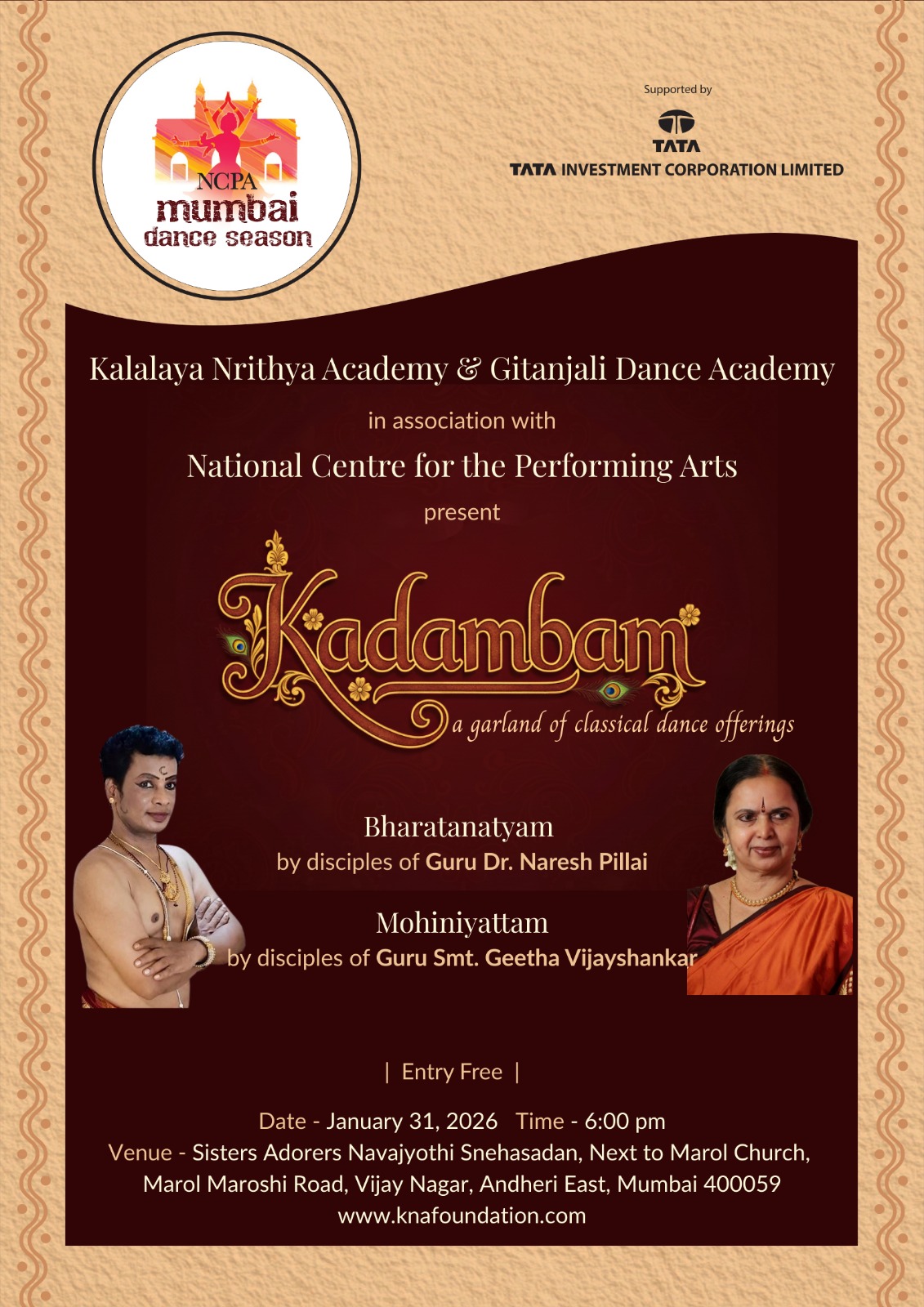 As part of the NCPA Mumbai Dance Season 2026, Kalalaya Nrithya Academy and Gitanjali Dance Academy, in association with the National Centre for the Performing Arts (NCPA), present “Kadambam – a garland of classical dance offerings” on January 31, 2026, at 6.00 pm.