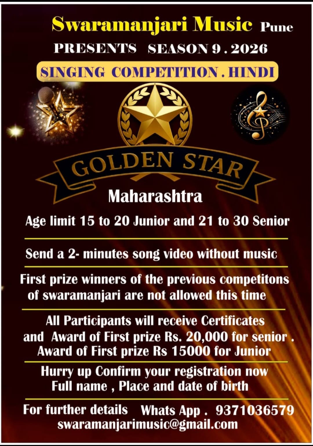 Swaramanjari Music, Pune, has announced Season 9 of its popular Hindi singing competition titled Golden Star Maharashtra 2026. The contest is open to young singing talents from across Maharashtra and aims to provide a vibrant platform for aspiring vocalists to showcase their skills.