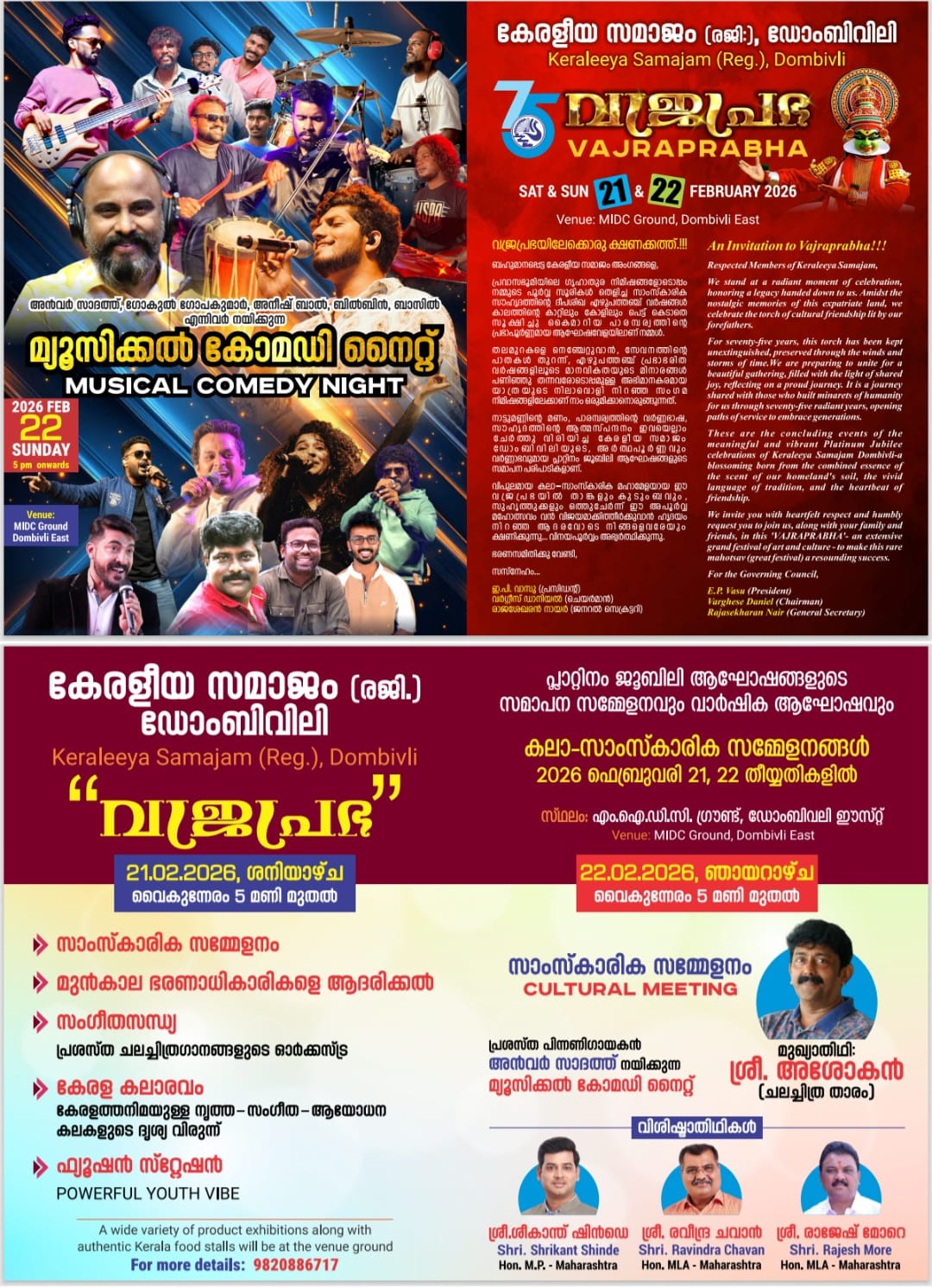 Kerala Samajam (Regd.), Dombivli, will host the grand closing ceremony of its Platinum Jubilee celebrations titled ‘Vajraprabha’ on February 21 and 22, 2026, at the MIDC Ground, Dombivli East. The two-day event will feature art and cultural conferences, cultural gatherings, Kerala-inspired performances, and a vibrant musical evening.