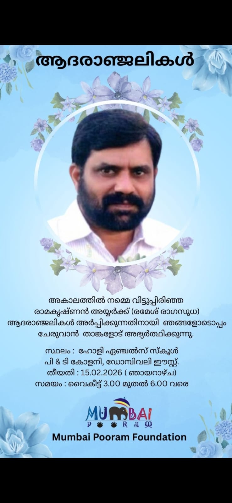 The Mumbai Pooram Foundation will organise a condolence and tribute meeting in memory of Ramakrishnan Iyer, popularly known as Ramesh Ragasudha, who passed away untimely.