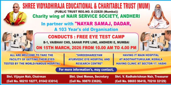 NSS Andheri under its charity wing SVECT is organising a Free Eye Test Camp as part of its ongoing social service initiatives. The camp will be held on Sunday, March 15, 2026, from 10.00 am to 4.00 pm at the NSS Office premises, B1, Vaibhav CHS, Sahar Pipe Line, Near Om Nagar, Andheri East, Mumbai.