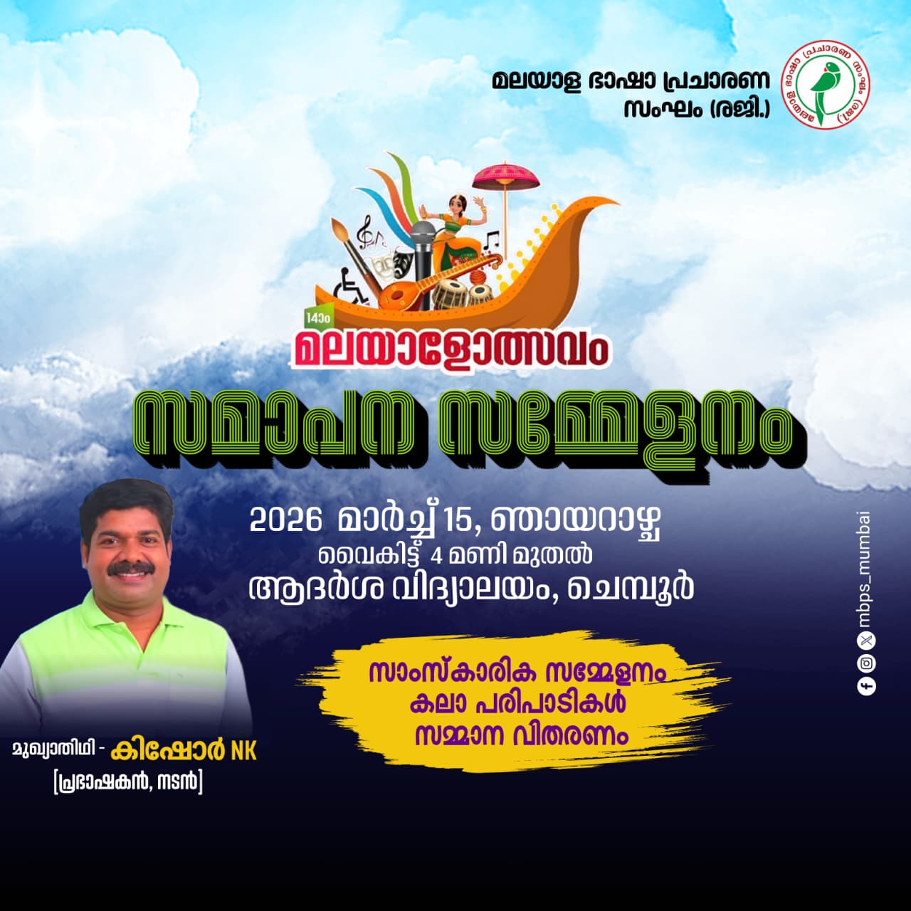 During the closing ceremony, awards will be presented to the winners of the Kendra Kalolsavam (Central Arts Festival) held at Adarsha Vidyalaya, Chembur on December 14th, along with prizes for the Drama Festival held on February 1st and the all-Maharashtra literary competitions organised by the Malayalam Language Promotion Group.