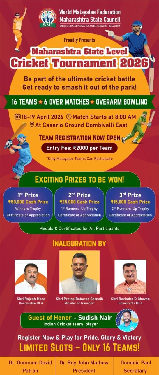 The World Malayalee Federation (WMF) Maharashtra State Council has announced the Maharashtra State Level Cricket Tournament 2026, scheduled to be held on April 18th and 19th at Casario Ground, Dombivli East.